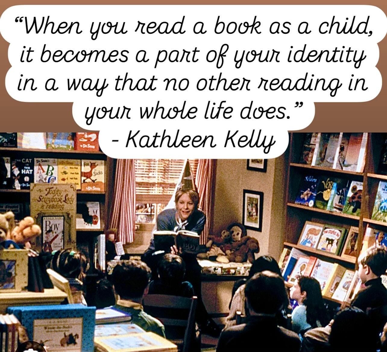 A few weeks ago, I first watched the 1998 Nora Ephron film Youāve Got Mail. Thereās a scene where the small bookstore owner Kathleen Kelly, played by Meg Ryan, says that āWhen you read a book as a child, it becomes a part of your identity in a way that no other reading in your whole life does.ā